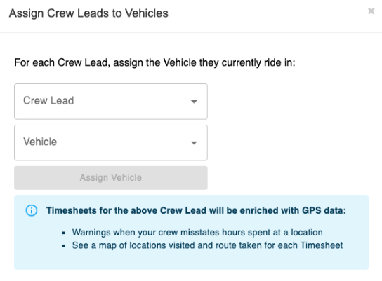 2. Assign Crew Leads to Vehicles- GPS data from tracker will pull over from FleetSharp into timesheets module here.
