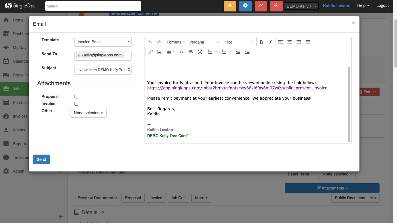 | Attachments | Select the box next to Proposal or Invoice if you would like to include an Attachment(s) as PDF. |