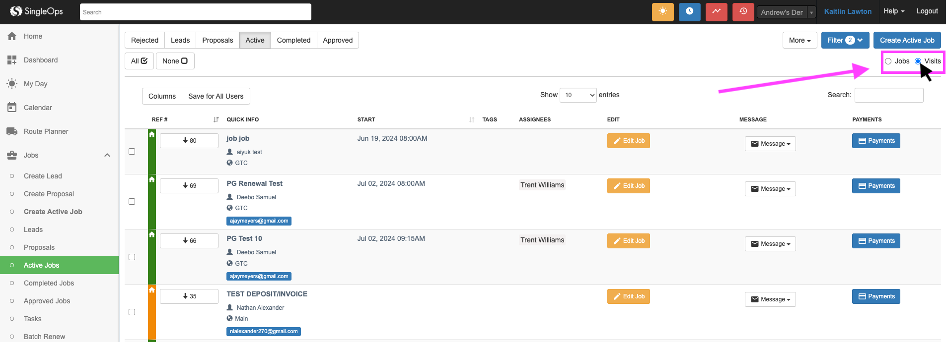 - In the top right corner select Visits from the Jobs / Visits page toggle.