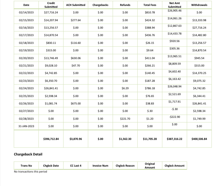 | Net | The total dollar amount processed by credit card and ACH minus chargebacks, refunds, and dues during statement period. (Credit submitted + ACH Submitted) - (Chargebacks + Refunds + Total fees + Dues) = Net |