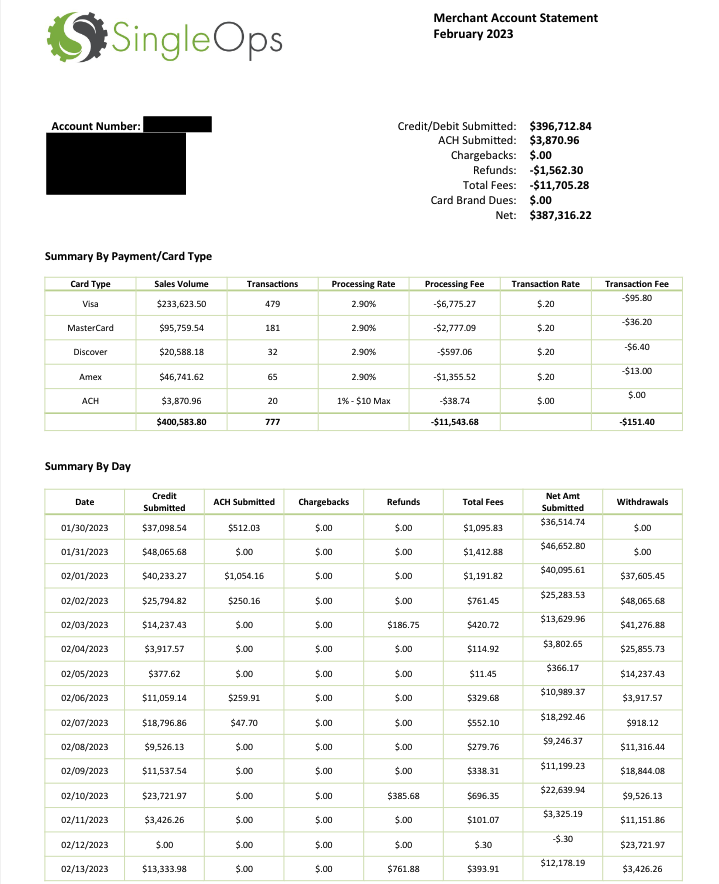 | Month / Year | The Merchant Statement will display all data within the month stated at the top of the page (February 2023). Recipient will receive this statement the following calendar month (March 2023). Dues (e.g. additional fees, dues and assessments) are calculated 2 months later and will appear in the statement issued the following month (February 2023 fees will show on April 2023 Merchant Statement). For more information on Dues - see Card Brand Fees below. |