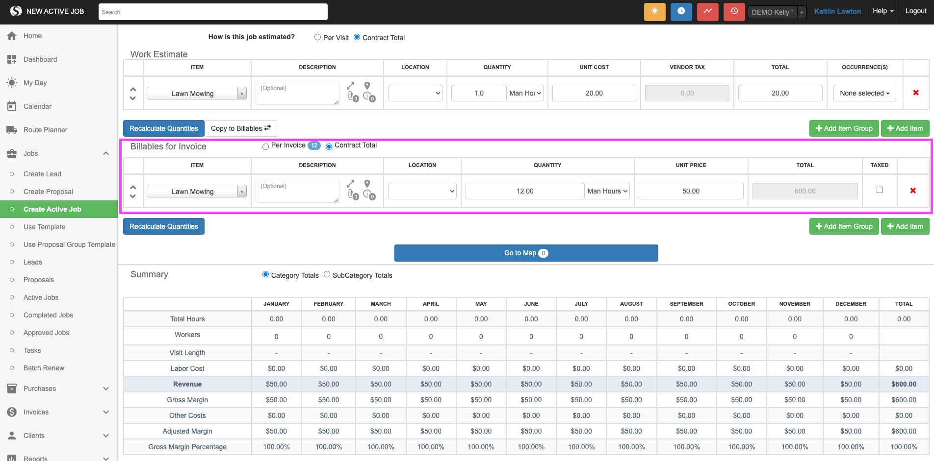 Here you will add the items for billing your customer that will display on the proposal and invoice. Note the number of invoices displayed in the blue circle. This is determined by the invoice frequency, start date and end date.