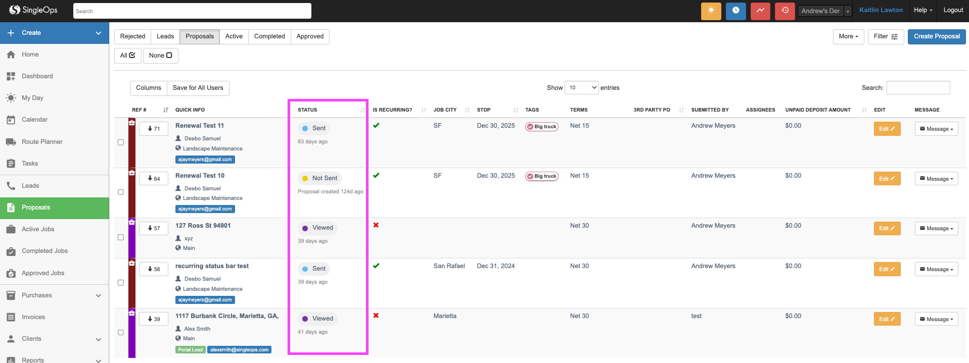 Statuses on the Proposal page help you immediately understand the critical details of a Proposal or Proposal Group. They are automatically set by information you input into SingleOps, and designed to help you action Proposals/Proposal Groups quickly. You can also filter by Proposal Status (Viewed, Sent, Not Sent).