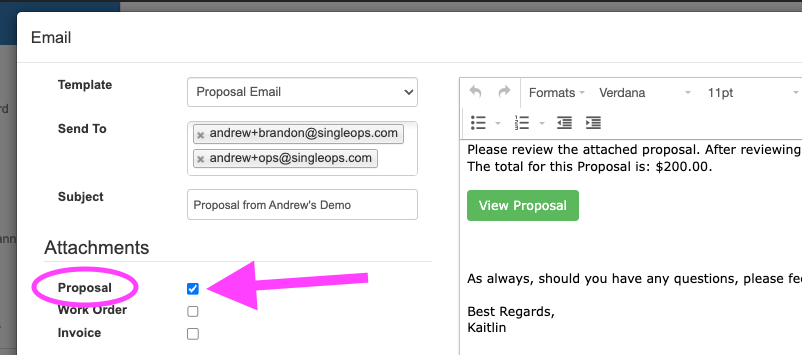 The Proposal has been sent and Viewed. *Note: If a Proposal is sent as an Attachment on the Email, and the client views the attachment but not the View Proposal link, it will NOT show as "Viewed" in SingleOps. |