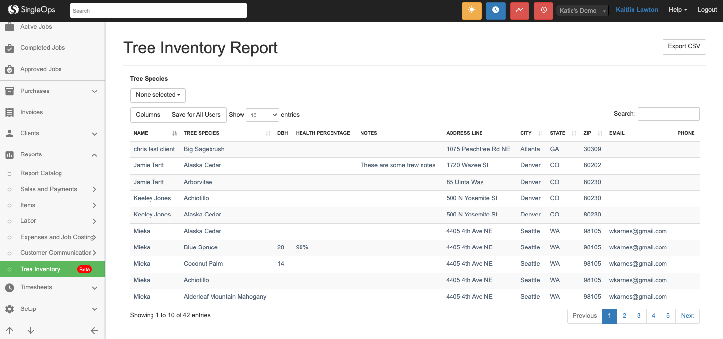 The Tree Inventory Report pulls the full list of trees that your business has taken inventory of on clients’ properties. This report will help you filter by tree species, customer, location, and more, giving you quick access to information that you can use to market specific services to clients.