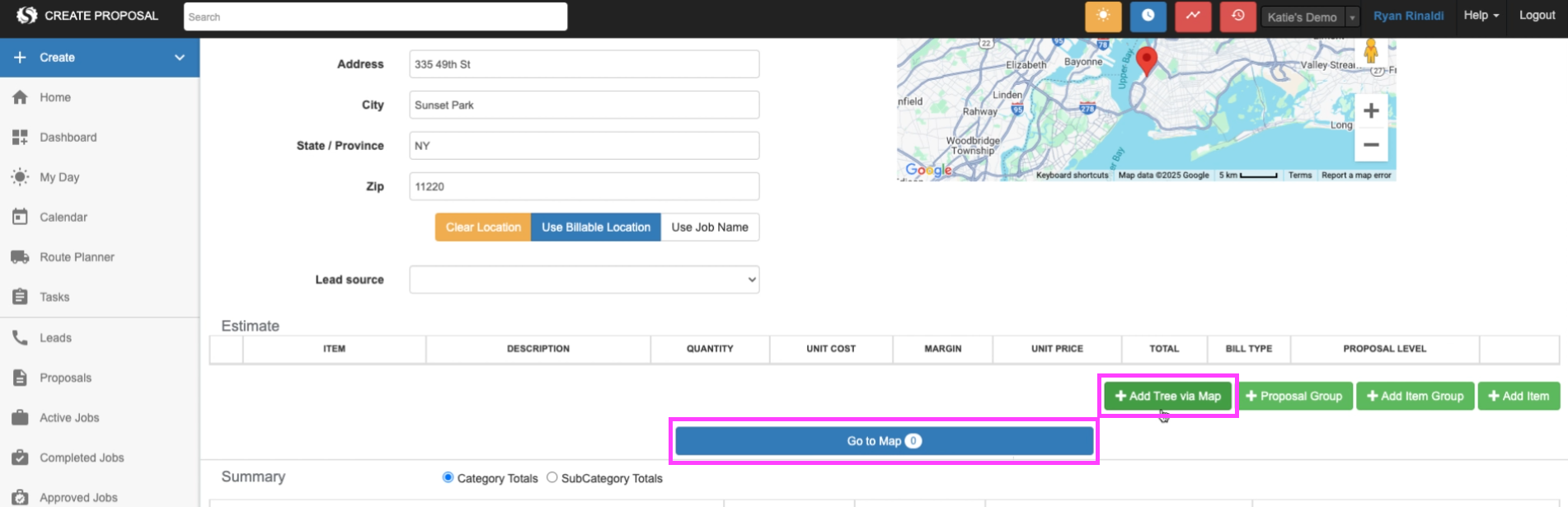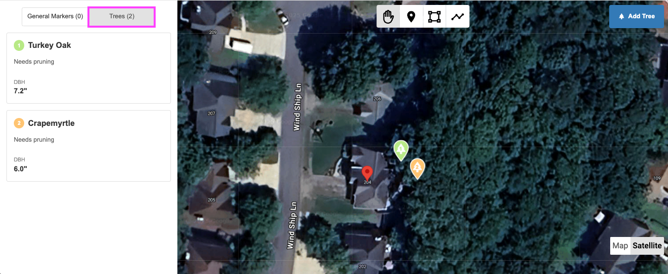 *Note: To view, add, or edit trees, ensure the Job has a previously created client and valid location specified. - Under the Estimate table, click the + Add Tree Via Map (or Go to Map button, next to the General Markers tab, click the Trees tab)