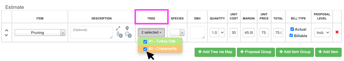 The Tree column on the Estimate table on the Jobs page will tie existing Line Items to one or more trees. This will allow estimators to add Items to existing trees (from a dropdown list) and will help sales arborists build proposals more quickly when visiting clients’ properties.