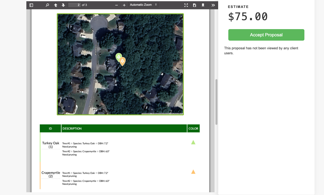 All marked trees + each tree's info will display on both the proposal and work order PDF for your client and crew to see.
