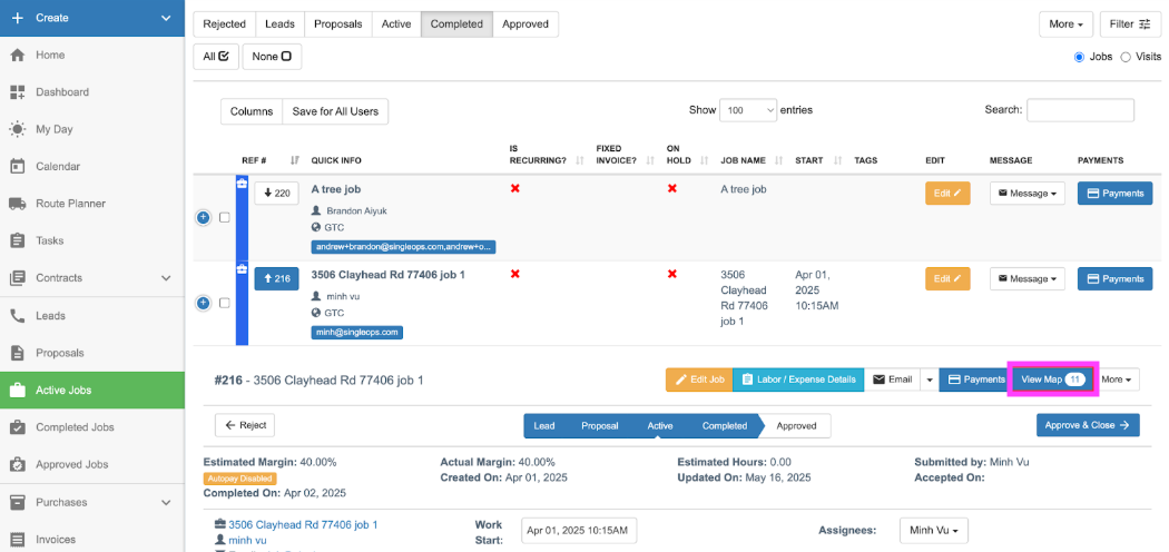 Crews can view Tree Inventory directly on the Job Show page, with markers and lists for improved visibility in the field. This is a view only view, to prevent unwanted updates / changes to the client map while the job is in progress.