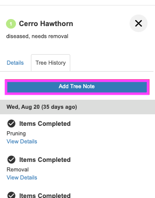 Tree Inventory allows you to add a tree(s) to a client’s property map on proposals, add details to that tree (e.g., species, DBH, and notes), view history, and you can also add Items to that tree on proposals.