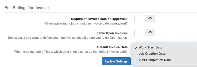 We’re adding “Visit Completion Date” as a new option for invoice dates. The “Today” option has been renamed “Job Creation Date” for clarity.