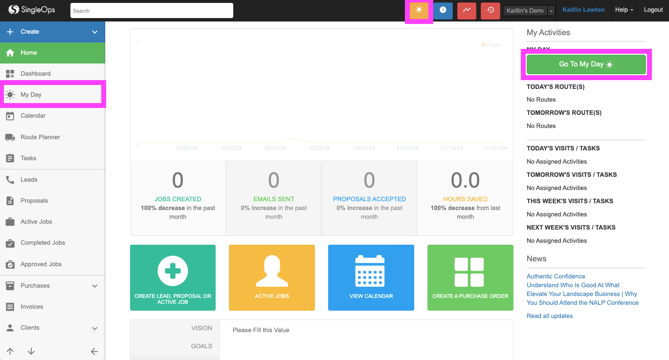 The My Day page allows Users to see their entire day in one centralized location and is ideal for Crew members to use in the field. Any assigned Task or Visit will display on the User's My Day page, even if the the Task/Visit is also assigned to other Users. Crew Users are also able to Clock In, Start Work, Complete Assigned Tasks/Visits, and Clock Out on this one page, simplifying and adding efficiency to his/her workflow.