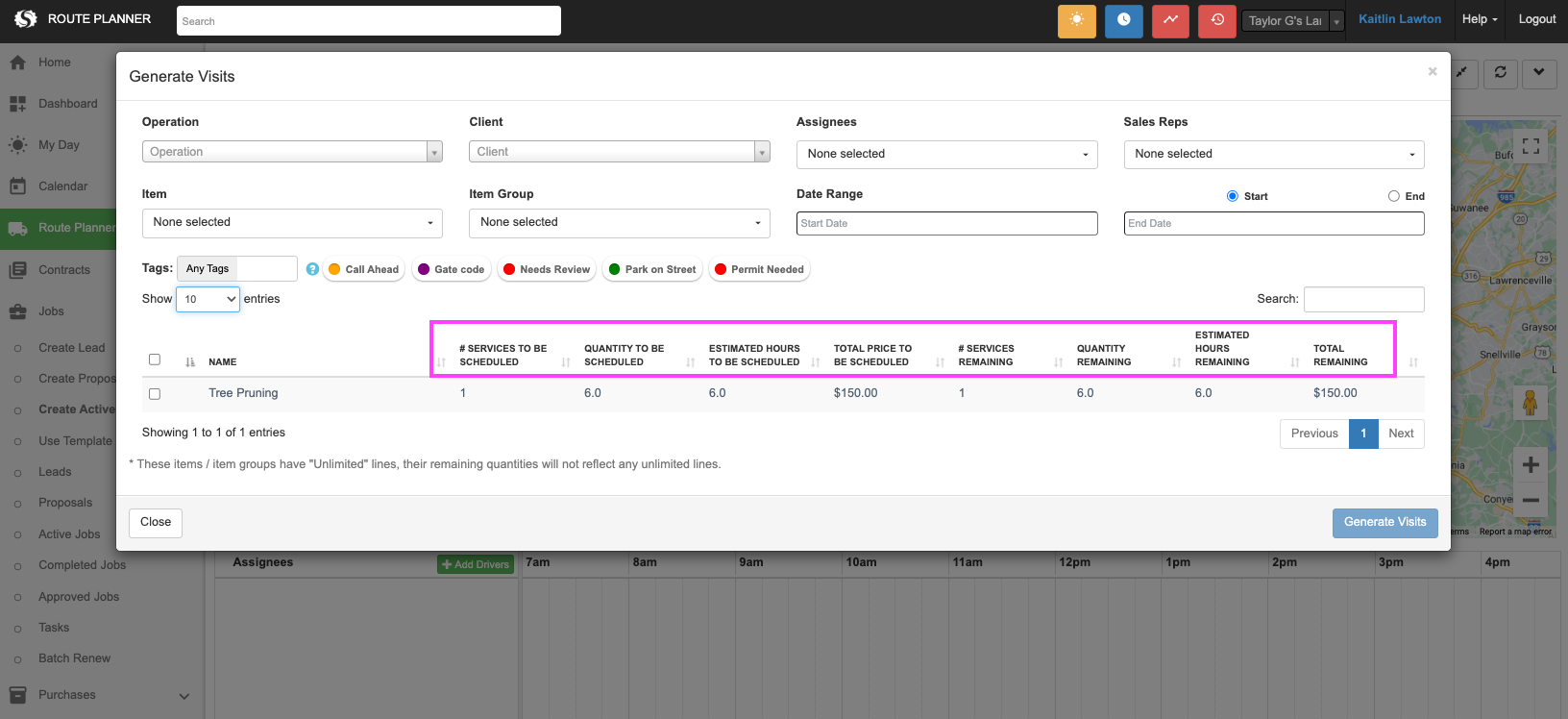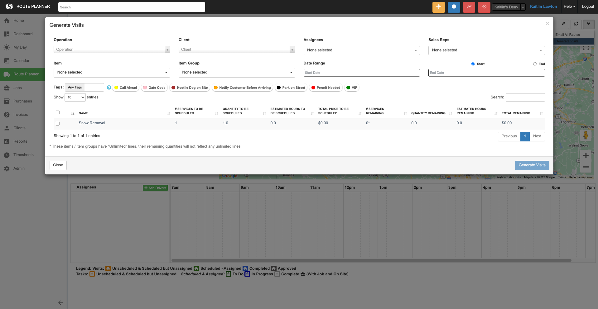 - Select Generate Visits from Route Planner by clicking the drop down in the top right corner.
