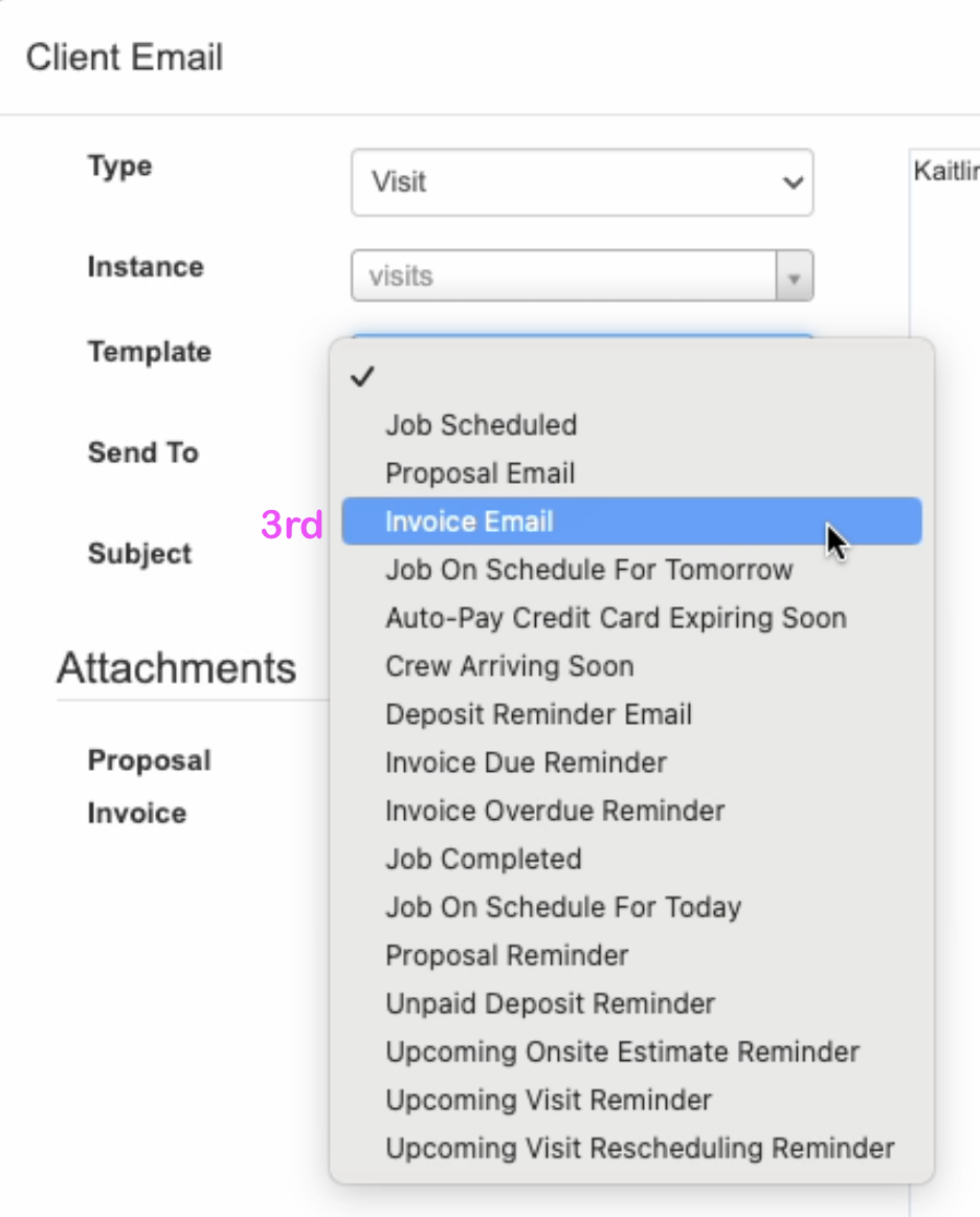 :visit_all_names: Client's and Contact's Name. *Note: For a Contact's email to auto populate in the "To" field, the Contact must be added to the Job.