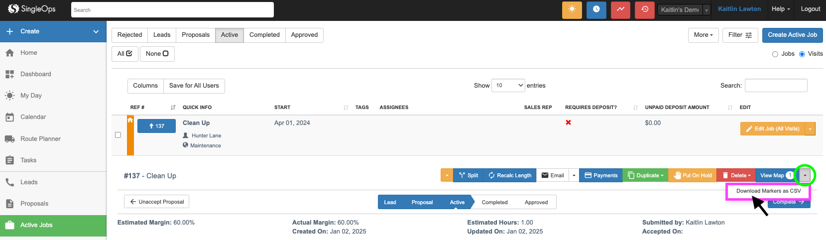 2. Locate your Job and the View Map blue button, next to that button there should be a dropdown arrow - select Download Markers as CSV
