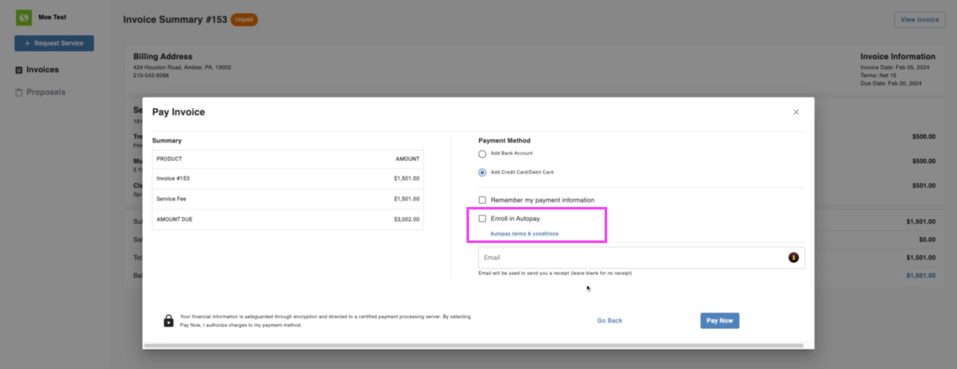• Now when your client pays an invoice for this Job, they are provided with the option to enroll in autopay.
