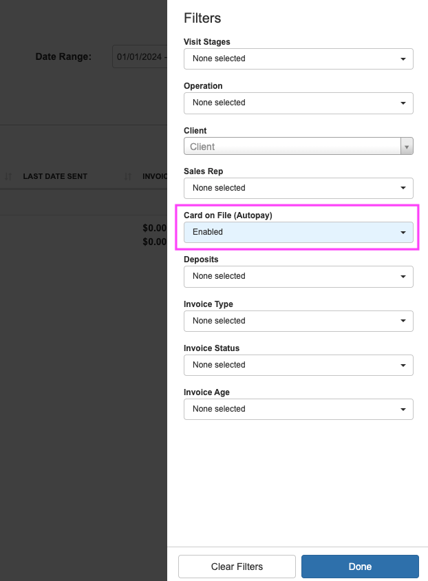 2. Click the Filters button to view clients that have a Card on File (Autopay) set to "Enabled".