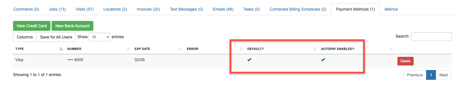 • The client needs to have a payment method on file, and the payment method needs to be listed as the "Default" and needs to have "Autopay Enabled?" turned on.