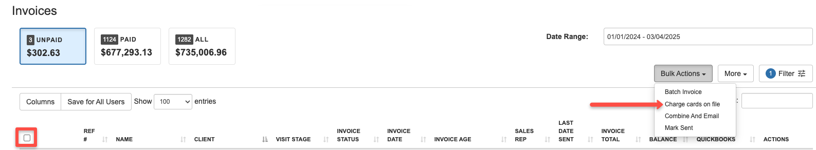 3. After the list on the Invoices page has been filtered, you can use the checkbox in the upper left of the results to check all the clients' names, and then use Bulk Actions > Charge cards on file to run their autopay.