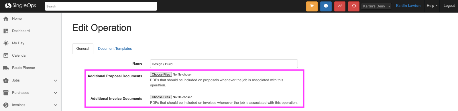 If a PDF is specific to a certain type of Operation (e.g., a design draft for Design/Build work), the PDF can be attached to the Operation & any documents (Proposal, Invoice, or Work Order) associated with that Job.