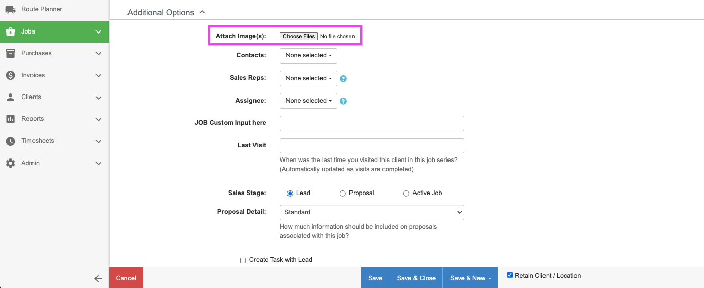 - From the Create a Lead, Proposal or Active Job page, under the Additional Options section, next to Attach Image(s), click Choose Files
