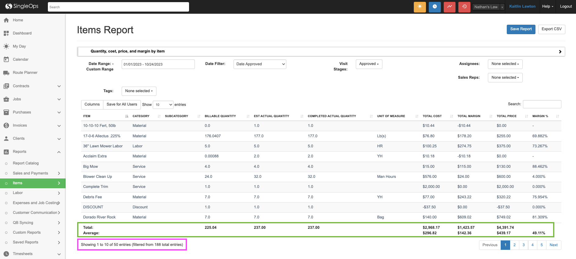 The SingleOps Items Report totals the usage and associated margins of Items across the stages selected.