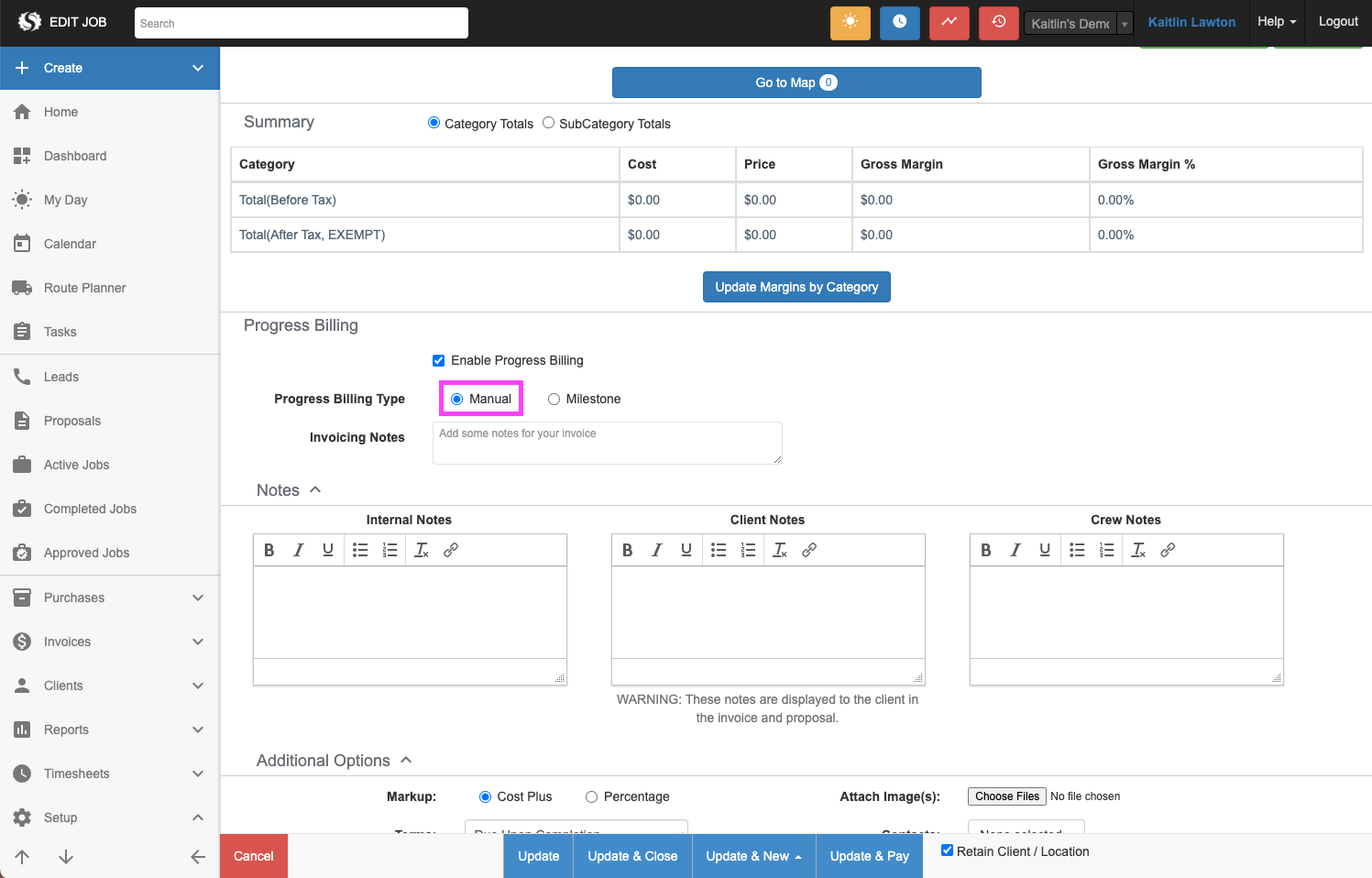 Invoices for Jobs with Progress Billing must be manually generated. Please follow the steps below to manually generate an invoice for Jobs with Manual Progress Billing enabled.