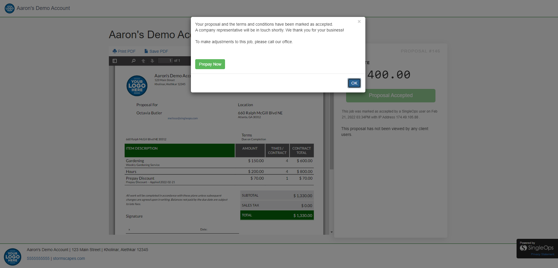 2. Once the proposal is accepted, your customer will be prompted to prepay. If SingleOps Payments connected, there is a Prepay button that will direct your customers to the page where they can Prepay for the total.