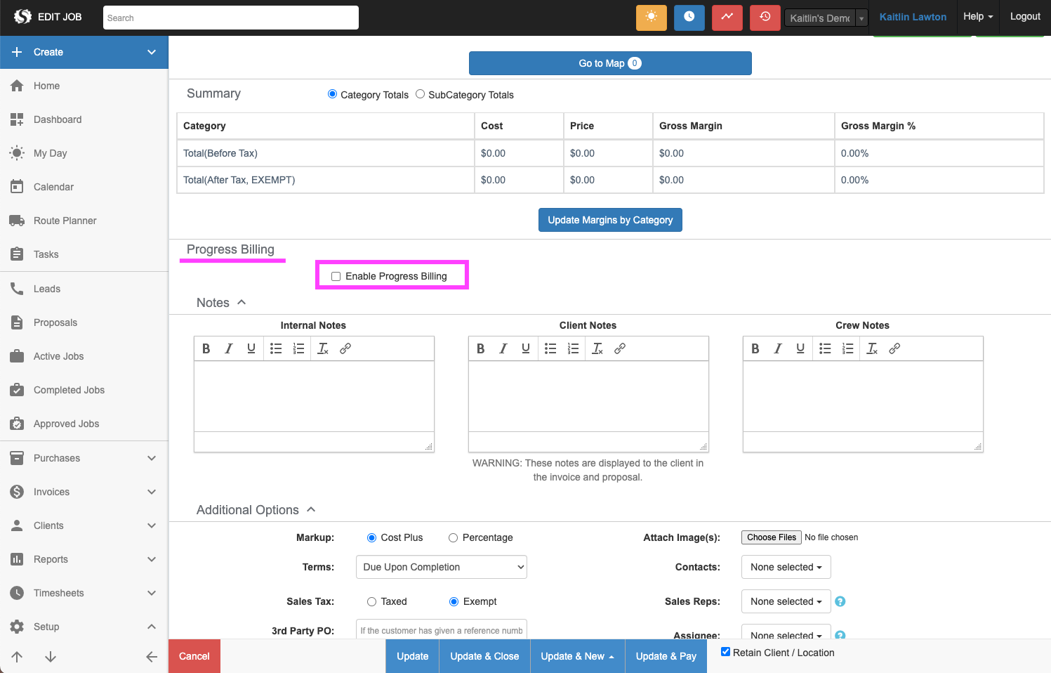 2. From any Job page, under the Progress Billing section, check the box next to Enable Progress Billing.