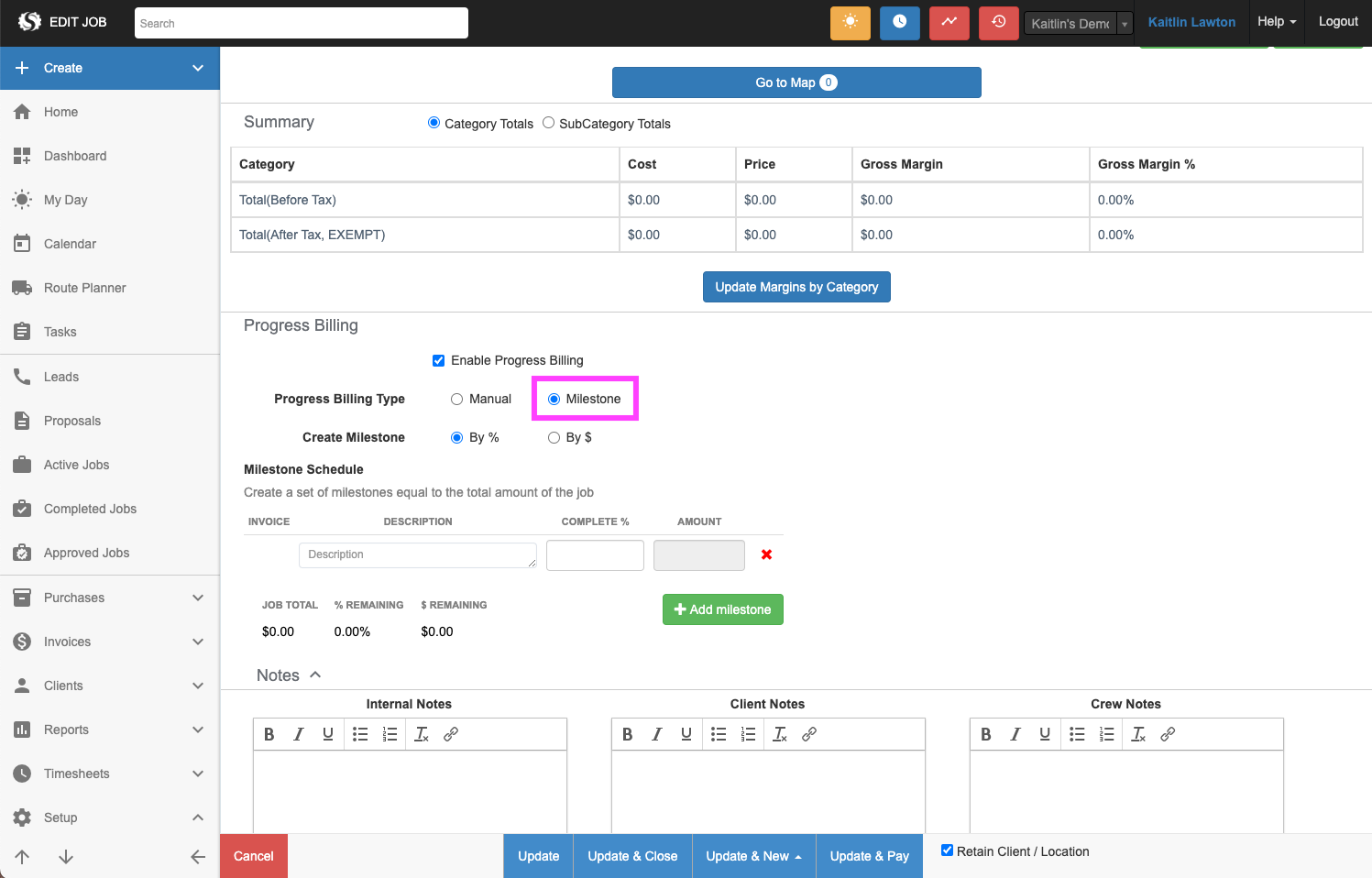 Progress Billing is an invoicing method for One-Off Jobs that allows you to bill clients based on completed work. Created with Design/Build in mind, this feature gives you more control over the invoicing process. It allows you to review the progress of a Job and manually create invoices as needed or create a Milestone and bill their clients as those milestones are reached. Milestone Billing allows you to set specific milestones based on the total price of the Job, either by dollar amount or by percentage of the total amount. Progress Billing can only be used for One-Off Jobs or for One-Off Jobs that have been split into multiple visits.