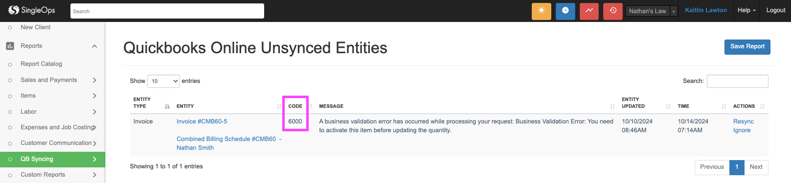 The QuickBooks Online Unsynced Entities should be checked daily. This will list all entities that are unable to sync from SingleOps into QuickBooks.